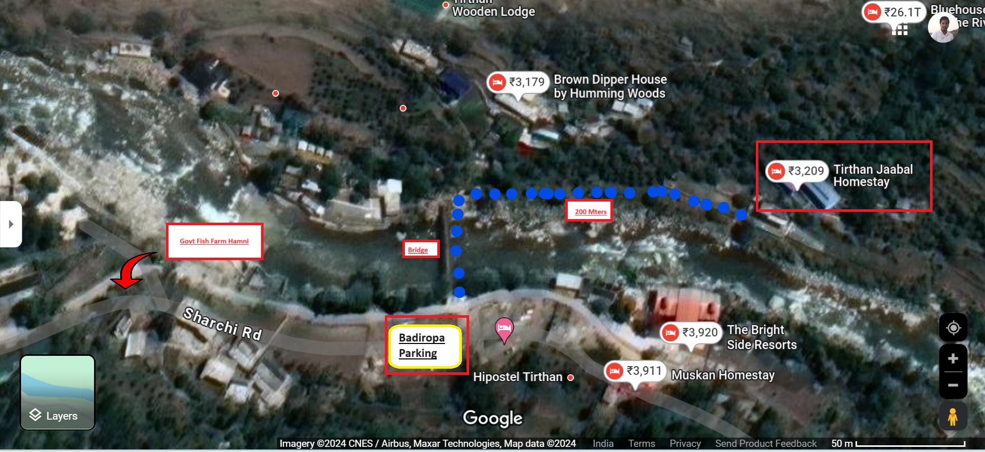 Flight : -> Land at Bhunter Airport -> Aut -> Larji -> Banjar (Take left Khundan ) -> Tirthan Valley -> Trout Fish Farm Hamni -> Badiropa (Parking) -> Walk to 200Mtrs Jaabal Home Stay.