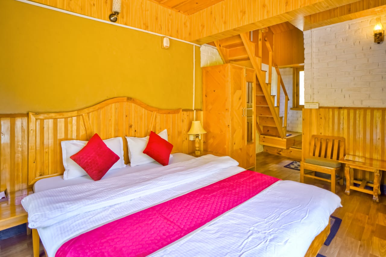 This is our Duplex Room in which there's a regular bedroom and the other room is an attic located upstairs. There's a sofa-cum-bed in the attic. It can be used as a comfortable seating area during the day and turned into a bed when needed. This is our premium room which can accommodate 4 people comfortably, it is well suitable for a Family or group of friends. It has a balcony and also Tirthan River View from balcony.